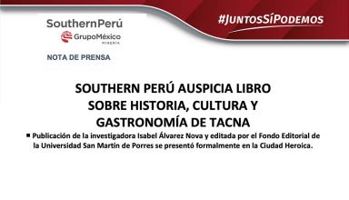 Julio 2022.- Un nuevo aporte de Southern Perú a la cultura y la educación de la región Tacna, mediante inversiones sociales que generan impactos positivos para toda la vida. Esta vez, auspiciamos el libro «Tacna, el sabor de la patria» (Fondo Editorial USMP, 2022), escrito por la reconocida investigadora social, Isabel Álvarez Novoa. La presentación formal de la obra, se …