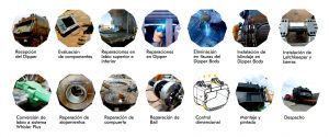 Durante el proceso, se procedió a la eliminación de fisuras de todos los componentes, así como el reemplazo de material base, elementos antidesgaste, recuperación de alojamientos de pines, y refuerzos estructurales, lo cual asegurará la confiabilidad durante la operación del Dipper alcanzando las expectativas del cliente. Otra de las tareas importantes consideró el reemplazo del sistema de GETs (Ground Engagement Tools), esta tarea involucró una recuperación completa de la geometría del labio del Dipper de tal forma que cumpla de manera adecuada con los requerimientos para la instalación del nuevo sistema de GETs.